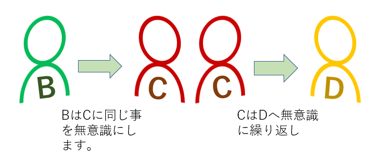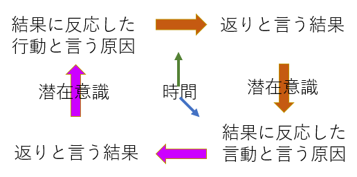 左の図は物凄く簡単にした図ですが、ここで注意する事は、返りと言う結果を受けた時、それが潜在意識に落ちてしまう事です。潜在意識に落ちた返りと言う結果が、他者に原因として反復されてしまう事です。そしてその他者でも又同じ事が起こり次へと繰り返されていく訳です。