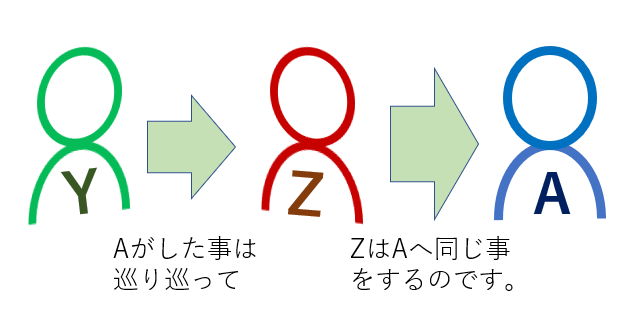 ある人を無視したりしてたら違う人から無視されたり、困ってる人を助けたら自分が困ってるときに違う誰かが助けてくれたり、と言った事です。