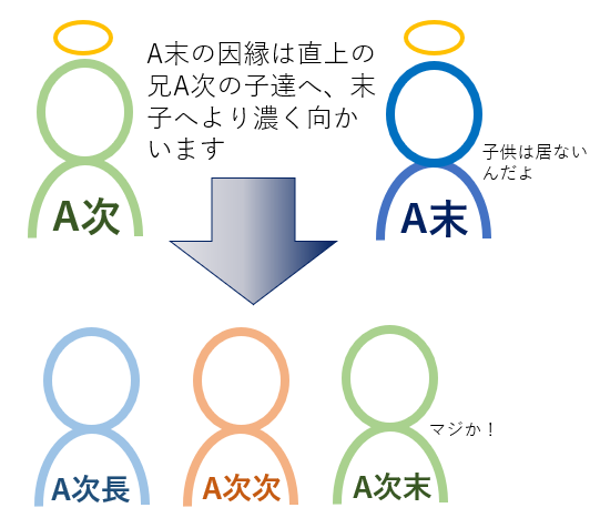 この因縁は末子により濃く向かうと言われています。いわゆる末っ子です。又、子供が居ないと兄弟の子孫へと向かうようです。