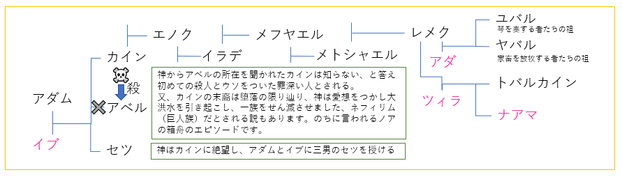 旧約聖書最初の章、創世記。壮大な人類誕生の物語が描かれています。先ず楽園が作られて動物が誕生し、神に似せた生き物が作られます。男性と女性の人間です。 男性はアダム、女性はイブと言います。 最初の人間は罪を知らない存在だったのですが、蛇がイブに「禁断の実」を食べると知恵が身に付くと伝え、イブはその実を食べアダムにも分け与えます。知恵を得ることで恥と欲にも目覚めた二人を見た神は激高し、二人を楽園から追放します。追放された二人は東へと出ていきます。やがて二人に長男カインと次男アベルそして三男セツの3人の子供に恵まれますが、長男カインは次男アベルを嫉妬心から殺してしまいます。(詳しくは旧約聖書の創世記を)罪を犯したカインは以後人間の罪深さを例える人物として伝わります。